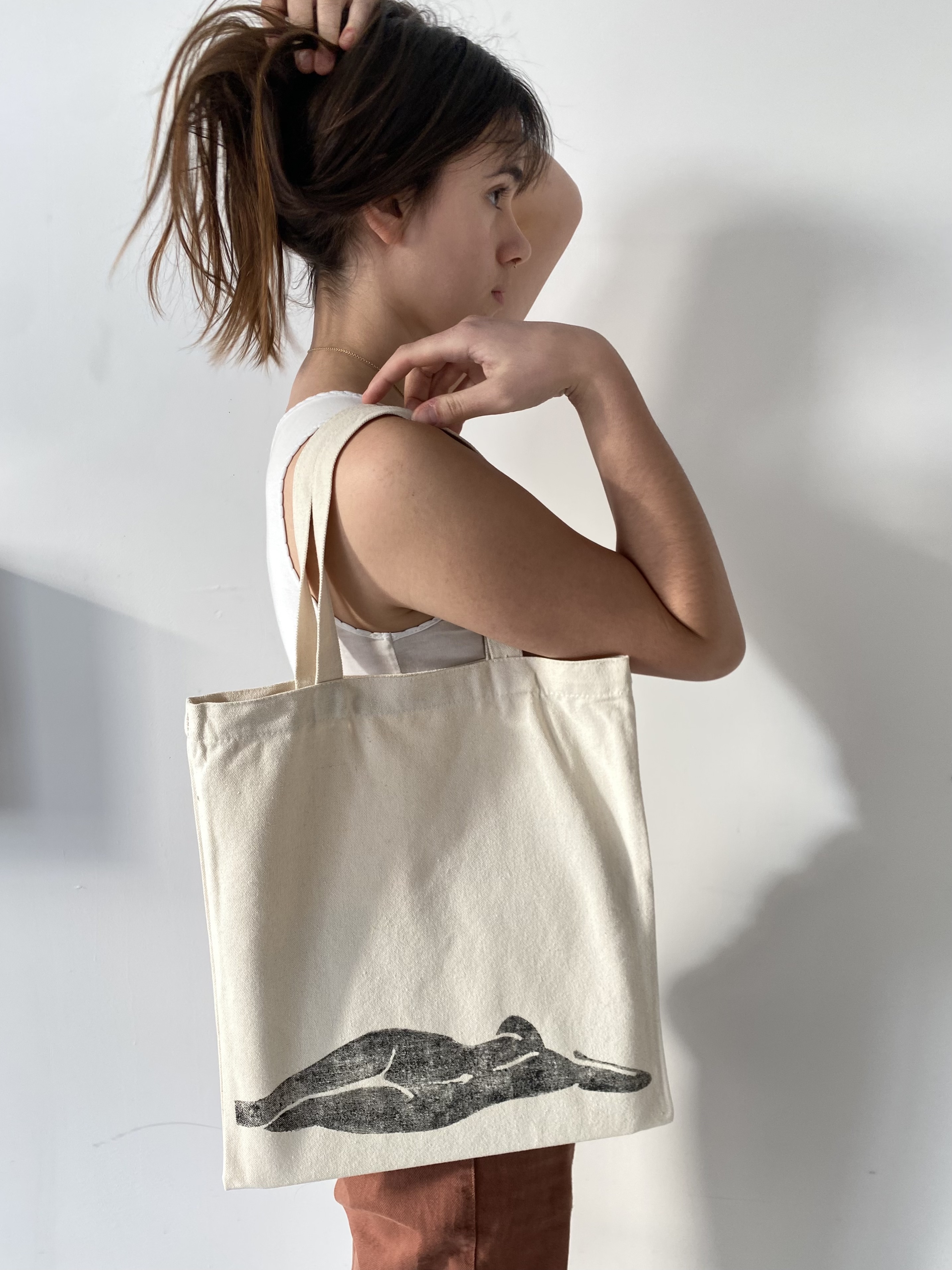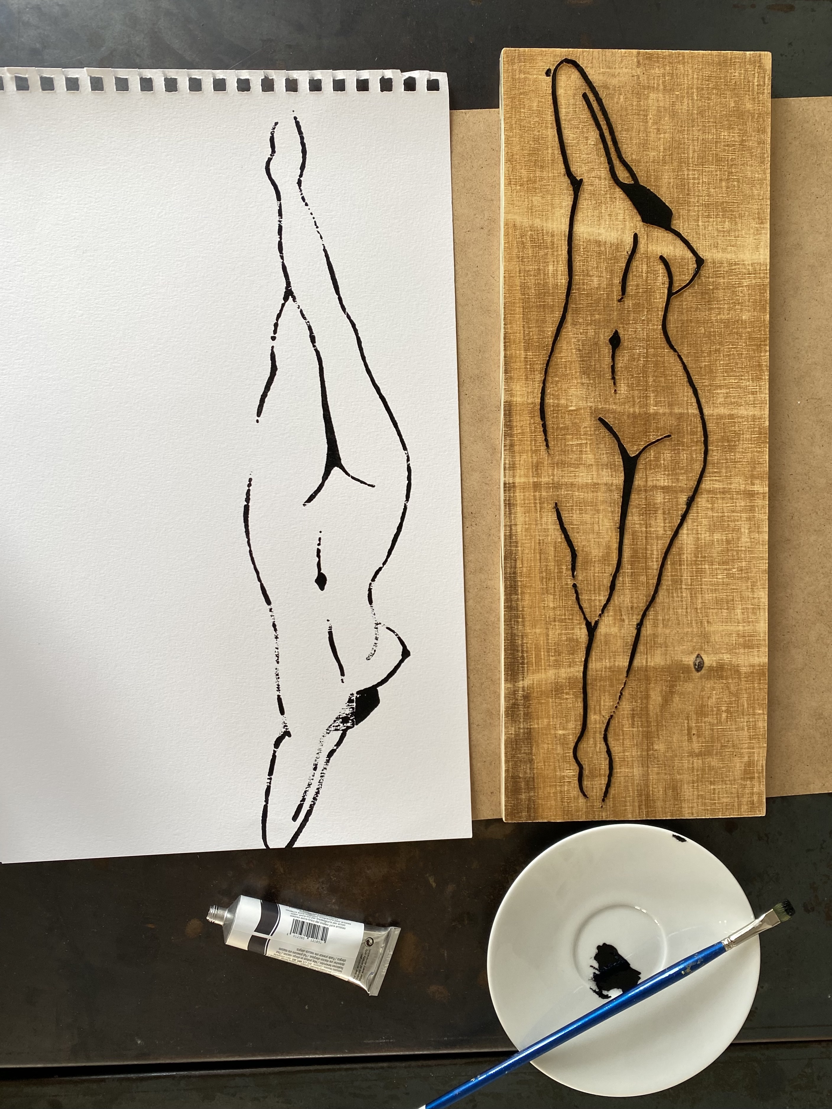 The Body&Soul Woodblocks are a set of 2 laser cut woodblocks. The image is based on a sketch of the sculpture Femme piquée par un serpent by Auguste Clésinger. The sketch was digitized and adapted to a vector based image for laser cutting. The wood is scrap wood. The woodblocks were hand brushed and printed onto a canvas tote bag and large scale paper.