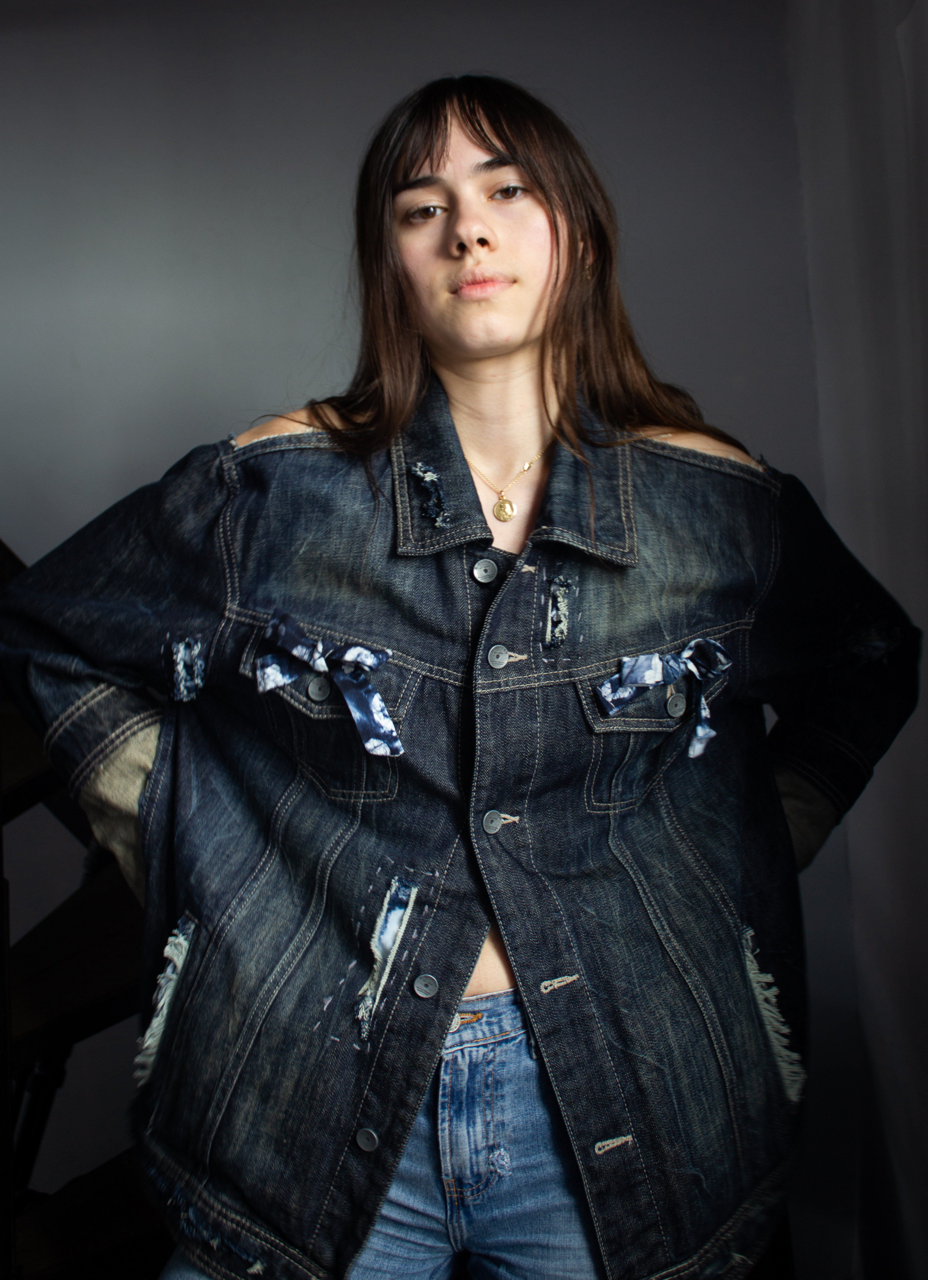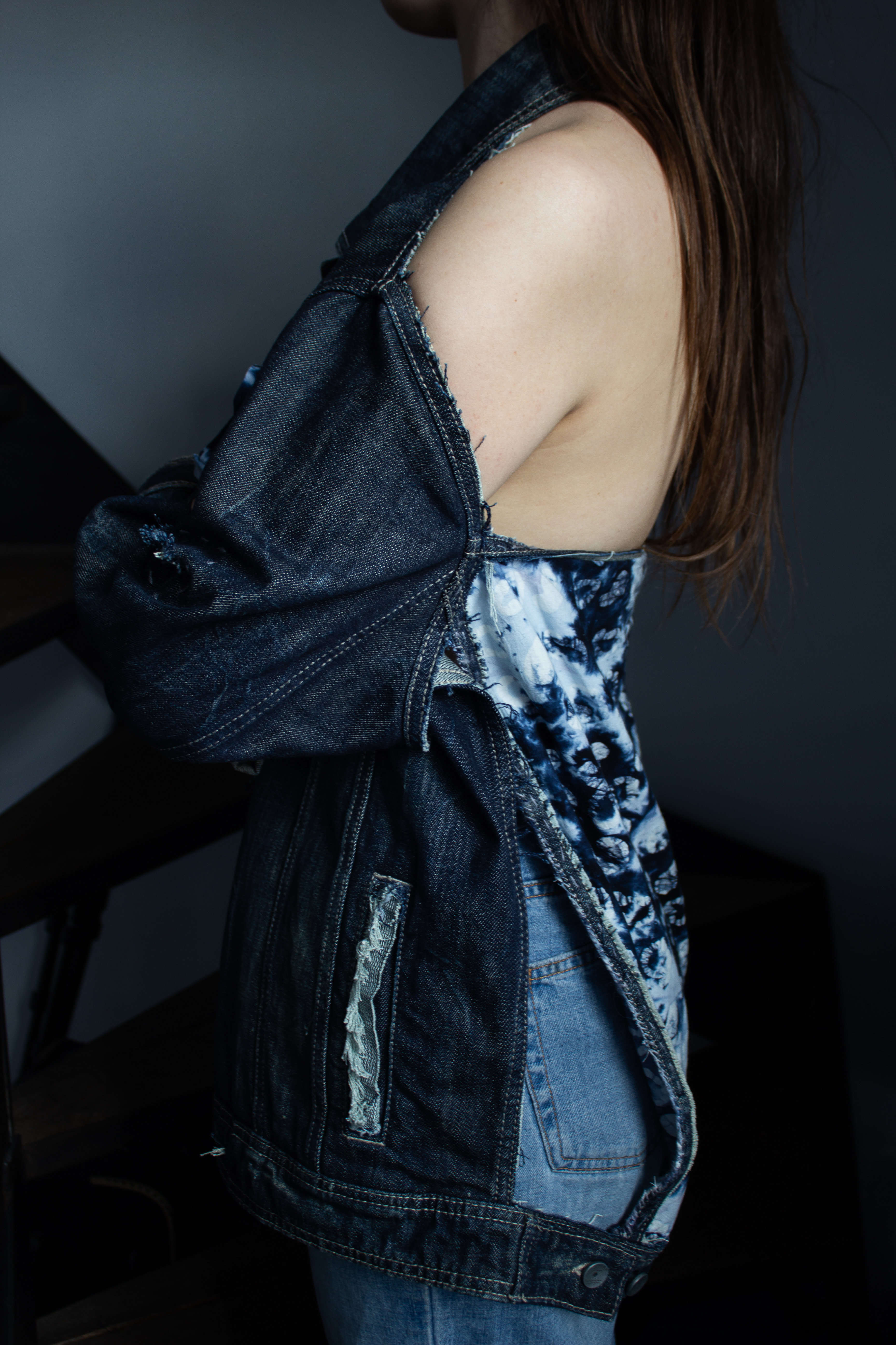 This jacket was reconstructed from a denim jacket, a cotton skirt, and yarn.